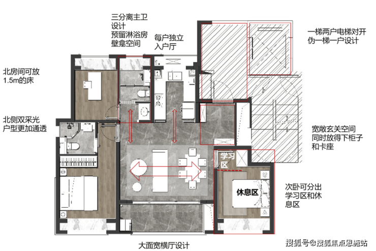 建面约90㎡的3室2厅2卫,一梯两户的设计,